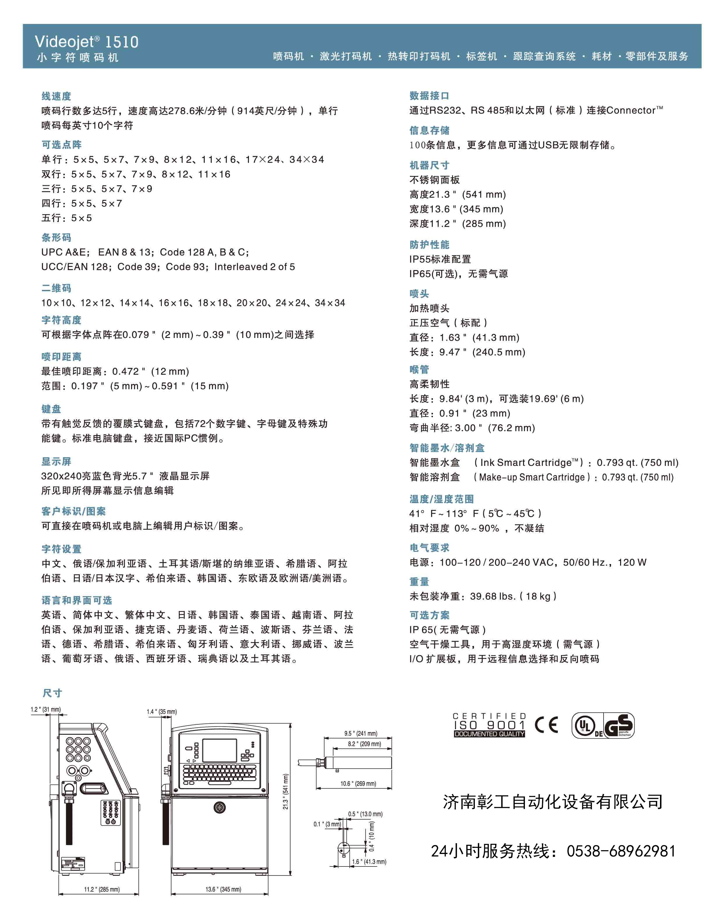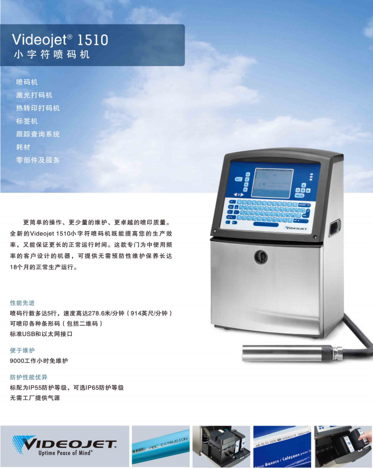 先進(jìn)的技術(shù)提升了產(chǎn)能 偉迪捷全新推出的1510小字符噴碼機(jī)是新一代1000系列產(chǎn)品打中最先問世的產(chǎn)品。相對之前的標(biāo)識設(shè)備,此款新小字符噴碼機(jī)提供了更長的無故障運(yùn)行時間和更優(yōu)質(zhì)的噴印效果。偉迪捷1510小字符噴碼機(jī)是為每天噴印16到20小時/一個星期六天的中使用頻率客戶設(shè)計的,可以適用于食品、飲料、化學(xué)、制藥和個人護(hù)理/化妝品行業(yè)。通過USB接口整合偉迪捷1510噴碼機(jī)的操作非常簡單,容許進(jìn)行熱插拔和信息備份。可通過Connector軟件和以太網(wǎng)輕松實(shí)現(xiàn)遠(yuǎn)程控制和診斷,便于實(shí)時進(jìn)行簡單的信息變更。故障檢修也可以通過操作界面上的“ i”鍵輕松實(shí)現(xiàn);通過彈出的窗口幫助操作員評估并解決問題。 特有的噴頭能根據(jù)環(huán)境變化自動設(shè)置和調(diào)節(jié)噴印參數(shù),即使在惡劣的環(huán)境下也能始終保持優(yōu)異的噴碼質(zhì)量。 偉迪捷(上海)噴碼機(jī)有限公司推出的創(chuàng)新型偉迪捷 1510小字符噴碼機(jī),不僅為標(biāo)識性能樹立了更高的標(biāo)準(zhǔn),還能達(dá)到最大正常運(yùn)行時間。偉迪捷1510 小字符噴碼機(jī)易于操作,擁有直觀的用戶界面和簡化的墨路系統(tǒng),配備業(yè)界首個帶有微芯片的油墨瓶,稱為“智能墨盒”(Smart Cartridges)。特有的噴頭能根據(jù)環(huán)境變化自動設(shè)置和調(diào)節(jié)噴印參數(shù),即使在惡劣的環(huán)境下也能始終保持優(yōu)異的噴碼質(zhì)量。 “偉迪捷1510小字符噴碼機(jī)的設(shè)計靈感直接來自偉迪捷廣大客戶的反饋意見 ,他們表示生產(chǎn)線正常運(yùn)行時間和持續(xù)高品質(zhì)噴碼是他們所關(guān)注的,”偉迪捷小字符噴碼產(chǎn)品經(jīng)理說:“偉迪捷為此推出了“智能”化的小字符噴碼機(jī),能真正消除操作員的失誤,延長兩次維修之間的間隔期,毫不費(fèi)力地實(shí)現(xiàn)最大正常運(yùn)行時間。” 偉迪捷1510小字符噴碼機(jī)是食品、飲料、化工、制藥及個人護(hù)理/化妝品等行業(yè)的理想設(shè)備。這是偉迪捷1000系列新型小字符噴碼機(jī)中最先發(fā)布的產(chǎn)品。 無污染、無浪費(fèi)、無錯誤 偉迪捷1510 小字符噴碼機(jī)配有業(yè)界首個智能墨盒,這是一個帶有微芯片功能的油墨瓶,能夠判定所安裝的油墨是否正確,防止油墨類型錯誤或溶劑和墨水安裝錯誤。智能墨盒形狀獨(dú)特,能夠完全耗盡油墨,不留一點(diǎn)殘余,從而進(jìn)一步實(shí)現(xiàn)成本節(jié)約。其針狀隔膜設(shè)計使操作員不必手動注入油墨,從而防止油墨溢出和浪費(fèi)。 集成機(jī)芯將噴碼機(jī)的關(guān)鍵墨路系統(tǒng)元件集成為一個部件,對于中使用頻率應(yīng)用而言,只需每隔9000小時或每隔18個月進(jìn)行一次預(yù)防性維護(hù)。用戶界面上的倒計時表可以顯示還剩多少時間必須更換機(jī)芯。機(jī)芯更換操作簡便,不會造成混亂;其設(shè)計能使客戶在30分鐘之內(nèi)自行完成更換,不需要技術(shù)人員親自到現(xiàn)場更換。 始終保持優(yōu)異的噴碼質(zhì)量 噴碼機(jī)在極其多樣的環(huán)境下工作,因此偉迪捷研制了動態(tài)校準(zhǔn)(Dynamic Calibration)功能。 “條件極熱或極冷會對油墨粘度造成干擾,從而影響噴碼質(zhì)量,” 偉迪捷小字符噴碼產(chǎn)品經(jīng)理說:“偉迪捷1510噴頭能根據(jù)環(huán)境變化自動調(diào)節(jié),無論當(dāng)前條件如何,都能保持噴碼質(zhì)量的一致性。這意味著操作員不需要花更多的時間人工調(diào)整噴頭! 通過USB接口整合偉迪捷1510小字符噴碼機(jī)的操作非常簡單,容許進(jìn)行熱插拔和信息備份?赏ㄟ^Connector軟件和以太網(wǎng)輕松實(shí)現(xiàn)遠(yuǎn)程控制和診斷,便于實(shí)時進(jìn)行簡單的信息變更。故障檢修也可以通過操作界面上的“ i”鍵輕松實(shí)現(xiàn);通過彈出的窗口幫助操作員評估并解決問題。 偉迪捷1510噴碼機(jī)參數(shù): 噴印速度:噴碼機(jī)行數(shù)多達(dá)5行,單行速度高達(dá)278.6米/分鐘(914英尺/分鐘) 可選點(diǎn)陣: 單行(5×5、5×7、7×9、8x12、11×16、17x24、34x34) 雙行(5×5、5×7、7×9、8x12、11x16) 三行(5×5、5×7) 四行(5x5、7x7)五行(5x5) 可根據(jù)字體點(diǎn)陣在0.079〞(2mm)-0.39(10mm)之間選擇 噴印距離: 最佳噴印距離0.472〞(12mm), 范圍0.197〞(5mm)-0.591〞(15mm) 鍵盤: 標(biāo)準(zhǔn)電腦鍵盤,包括72個數(shù)字鍵、字母鍵及特殊功能鍵 顯示屏: 320×240亮藍(lán)色背光5.7〞液晶顯示屏,所見既所得屏幕顯示編輯信息 客戶標(biāo)識/圖案: 可直接在噴碼機(jī)或用VJ專用軟件在電腦上編輯用戶標(biāo)識/圖案 字符設(shè)置; 中文、日語/日文漢字、韓國語、阿拉伯語、希伯萊語、俄語、保加利亞語、土耳其語/斯堪的納維亞語、希臘語、東歐語及歐洲語/美洲語。 語言可界面可選: 簡體中文、繁體中文、日語、韓國語、越南語、泰國語、阿拉伯語、英語、保加利亞語、捷克語、丹麥語,德語、芬蘭語、法語、匈牙利語、意大利語、挪威語、波蘭語、葡萄牙語、俄語、西班牙語、瑞典語和土耳其語。 機(jī)器尺寸: 不銹鋼機(jī)箱,高21.3〞(541mm),長13.6〞(345mm), 寬11.2〞(285mm) 防護(hù)等級: IP55 噴頭: 加熱噴頭 直徑1.63〞(41.3mm),長度9.47〞(240.5mm) 喉管: 高