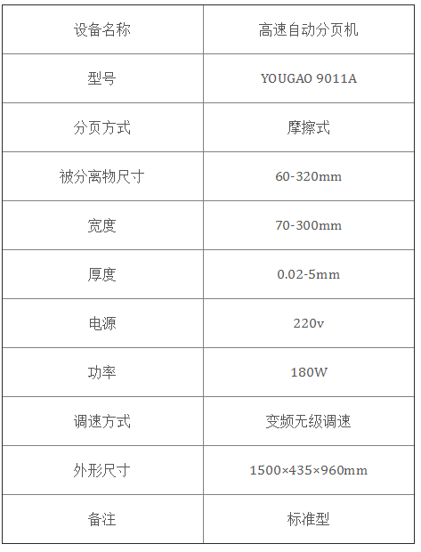 適用范圍: 1、包裝袋:塑料袋、紙盒、紙袋、標簽、紙片等。 2、片狀物品:IC卡、IP卡等 用途: 用于將成疊的包裝袋或卡類自動分開,成單頁傳送到輸送帶上,便于噴碼機或激光機進行噴印、噴刻生產(chǎn)日期、批號、防偽標記、圖案等,從而減少人工分頁的繁瑣,充分發(fā)揮噴碼機、激光機的高速噴印優(yōu)點,提高噴印工作效率,方便生產(chǎn)管理。 特點: 1、進口變頻無極調(diào)速,高速自動分頁60-600個/分鐘。 2、分頁高速度、定位高精度、生產(chǎn)高效率。 3、結(jié)構(gòu)設(shè)計合理,更換易損件簡單快捷。 4、可選附件:*自動收料裝置*分頁機單獨計數(shù)停機信號源*可自動進行計數(shù),也可自行設(shè)定分頁數(shù)量,到要求分頁數(shù)量自動停機,設(shè)定范圍1-9999(需要與噴碼機、激光機信號共享)。 |